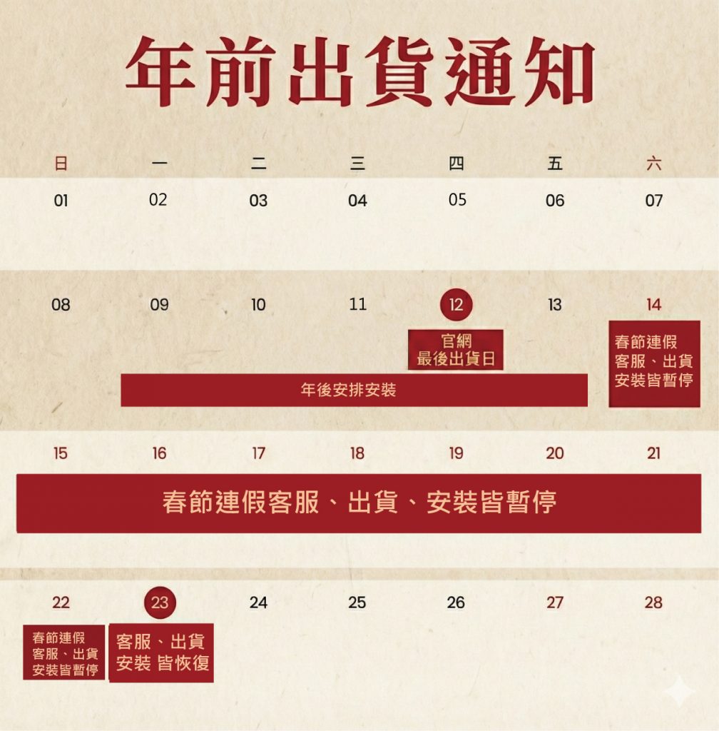 - 2/14(六)~ 2/22(日):春節連假期間,客服、出貨、安裝皆暫停